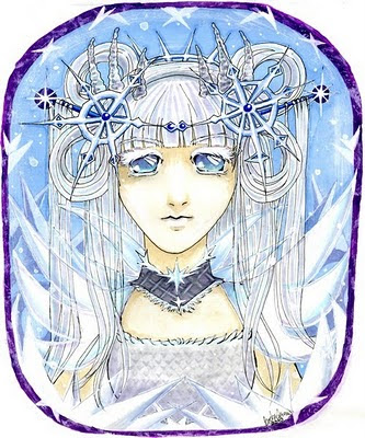 Filled in more of the background, frame, more of her outfit, headdress, etc. After this point I didn't document it, but I mostly used ink pots and used white and purple ink to finish up the frame.